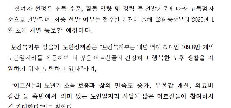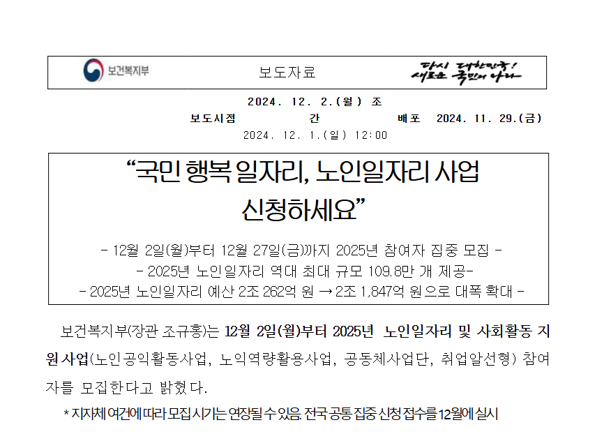 노인들의 경제적 안정과 사회적 참여를 돕기 위해 마련된 이 사업은 2024년 12월 2일부터 참여자를 모집합니다.