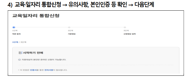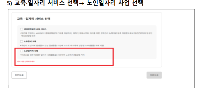 - 통합 신청: 교육·일자리 통합신청 페이지로 이동하여 노인일자리사업 항목을 선택합니다.
