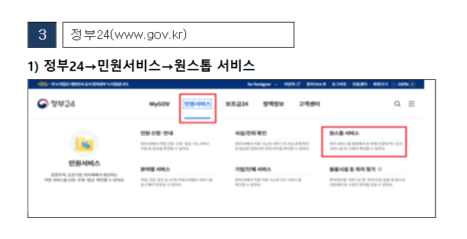 - 상단 메뉴에서 ‘민원서비스 → 원스톱 서비스’를 클릭합니다.