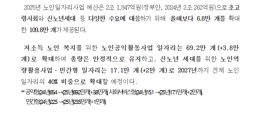 - 109.8만 개의 일자리로 더 많은 노인이 참여 가능.