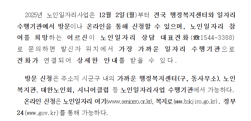 - 문의: 노인일자리 상담 대표전화 ☏1544-3388