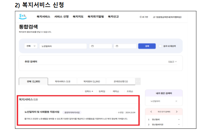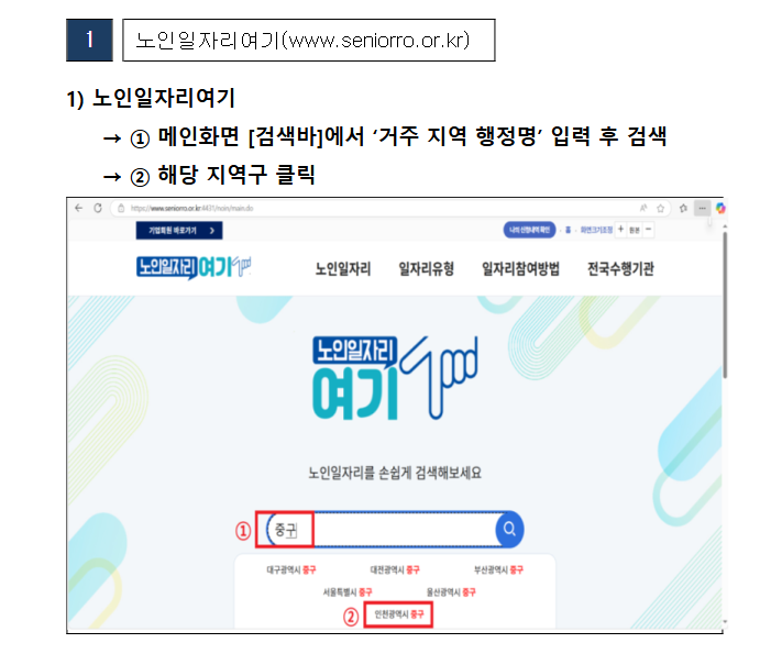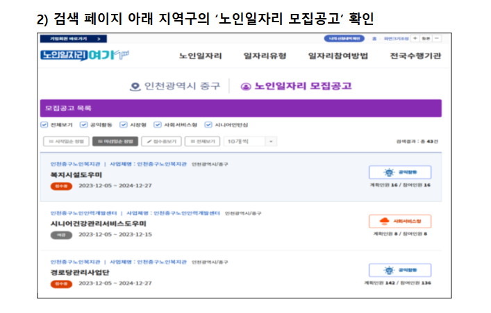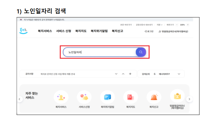 - 검색: 검색창에 ‘노인일자리사업’을 입력한 후 검색 결과를 클릭합니다.