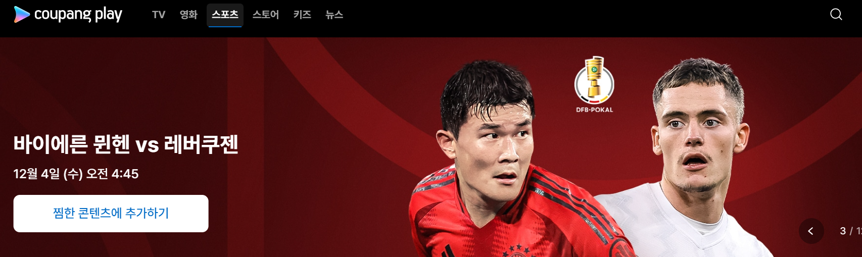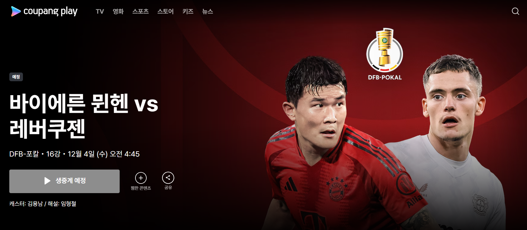 2024년 12월 4일, 바이에른 뮌헨과 레버쿠젠의 DFB 포칼 16강 경기는 쿠팡플레이에서 실시간으로 중계됩니다.