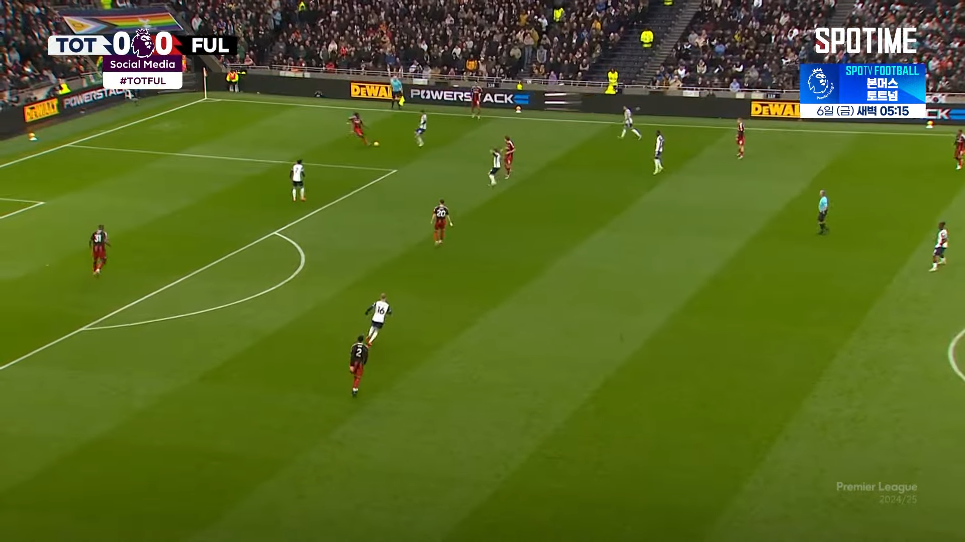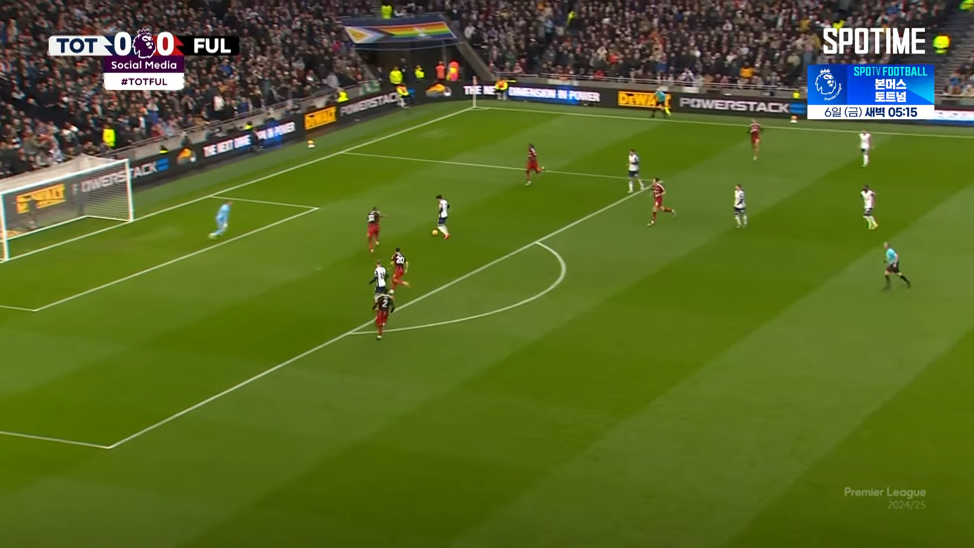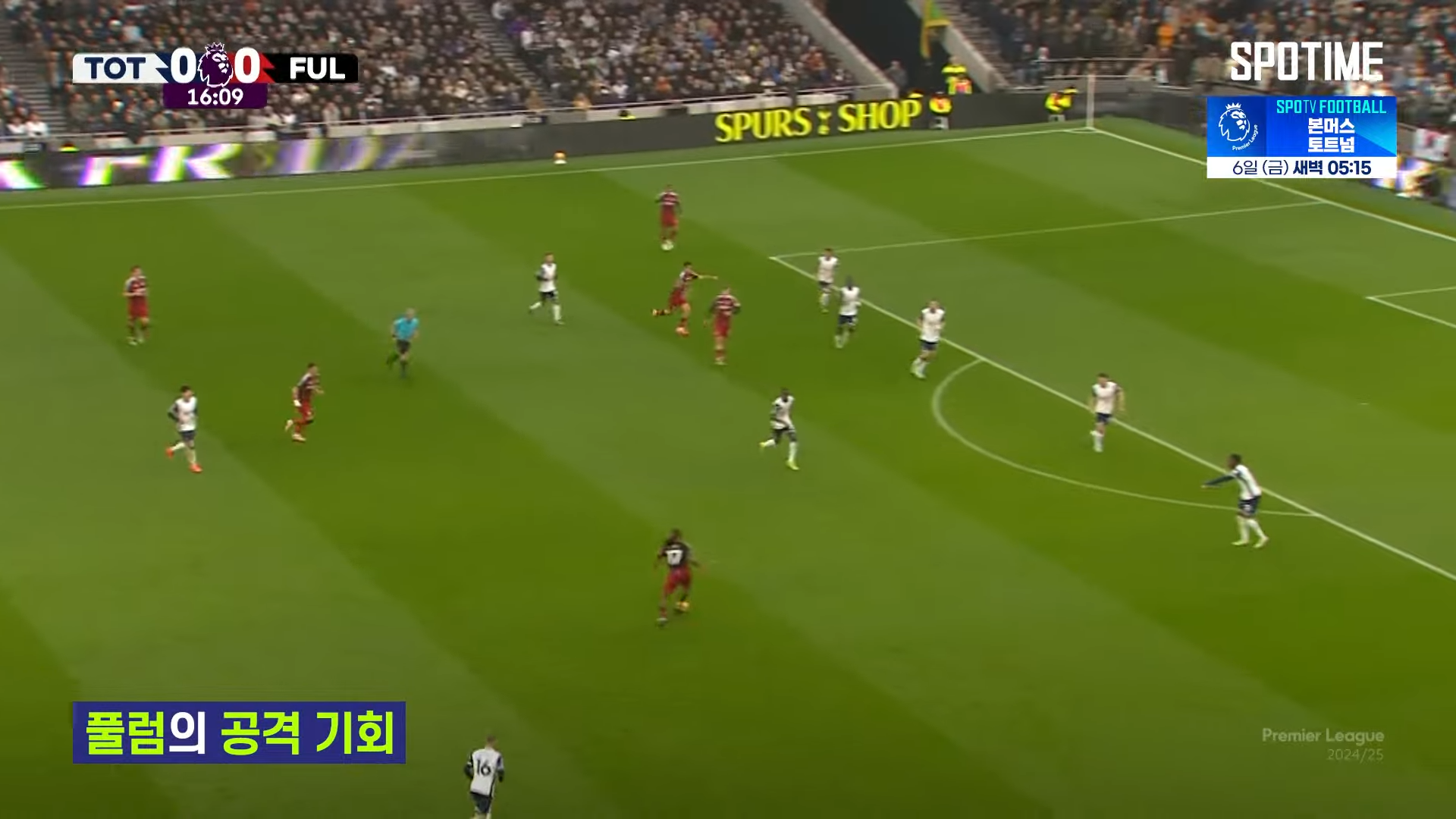 전반 12분, 풀럼은 측면에서 날카로운 크로스를 시도하며 토트넘의 수비를 위협했습니다.